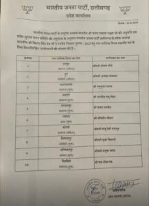 प्रदेश भाजपा ने 10 नगर निगम के लिए महापौर उम्मीदवारों की सूची जारी कर दी है। इसमें रायपुर से मीनल चौबे, राजनांदगांव से मधुसूदन यादवभाजपा, कोरबा से संजूदेवी राजपूत, बिलासपुर से पूजा विधानी, रायगढ़ से जीव वर्धन चौहान, जगदलपुर से संजय पांडे और दुर्ग से अलका वाघमार को टिकट मिला है