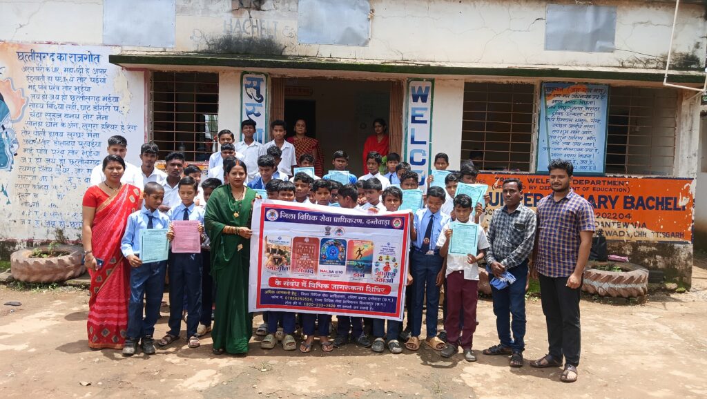 एस एच अज़हर दंतेवाड़ा बचेली :- माननीय अध्यक्ष जिला विधिक सेवा प्राधिकरण दंतेवाड़ा के निर्देशानुसार अंतर्राष्ट्रीय जनसंख्या दिवस के अवसर पर दिनांक 11/07/2025 दिन शुक्रवार शासकीय उच्च प्राथमिक शाला स्कूल बड़े बचेली में बच्चों को नालसा आशा योजना , नालसा जागृति योजना , नालसा संवाद योजना,के तहत शारीरिक एवं गुड टच बैड टच एवं बाल विवाह अपराध, घेरलु हिंसा के बारे में जागरूकता हेतु जानकारी दी गयी एवं बाल मजदूरी ना करने पढ़ाई लिखाई कर अपना भविष्य प्रेरित करने को कहा गया इसमें साथ ही इस प्रकार की कोई घटना होने पर अपने परिजन को अवगत करा कानूनी सहायता हेतु नजदीकी पुलिस थाना मे संपर्क करने हेतु जानकारी प्रदान की गई जिसमे थाना बचेली से पी.एल.व्ही. रीता चौहान,रंजीता यादव, शुभम यादव, नंदकिशोर नाग शिक्षक एवं छात्र मौजूद रहे
