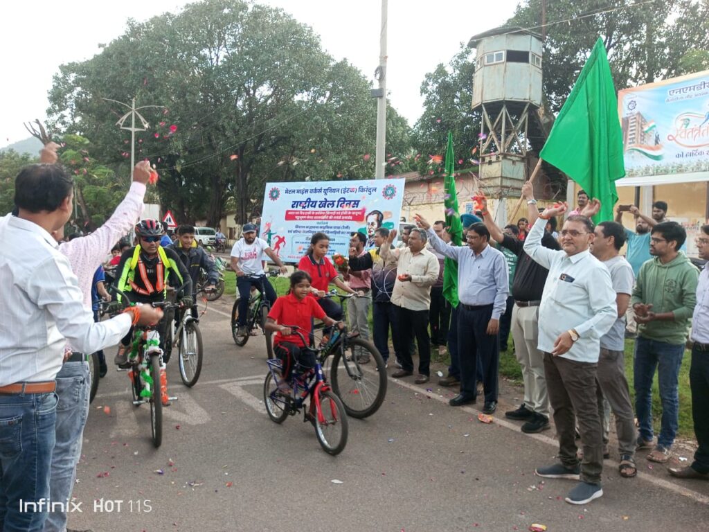 एस एच अज़हर दंतेवाड़ा किरंदुल: राष्ट्रीय खेल दिवस और हॉकी के जादूगर पद्मभूषण मेजर ध्यानचंद की जयंती के अवसर पर 29 अगस्त को मेटल माइंस वर्कर्स यूनियन (इंटक) शाखा किरंदुल ने प्रतिभावान खिलाड़ियों को प्रोत्साहित करने के लिए एक सद्भावना साइकिल रैली का आयोजन किया। रैली का शुभारंभ शुक्रवार शाम 5 बजे एनएमडीसी किरंदुल के फुटबॉल ग्राउंड से मुख्य महाप्रबंधक (उत्पादन) के.पी. सिंह और डीजीएम (पर्सनल) तनवीर जावेद ने हरी झंडी दिखाकर किया।