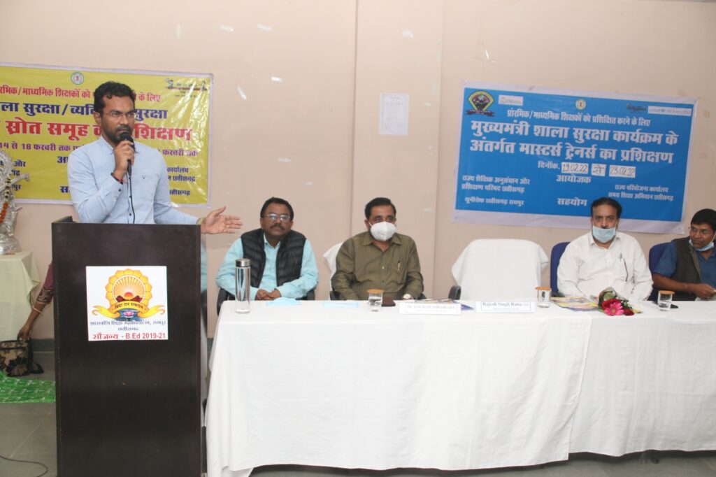 रायपुर, 23 फरवरी 2022 स्कूल शिक्षा विभाग के संयुक्त सचिव व एससीईआरटी के डायरेक्टर राजेश सिंह राणा ने कहा कि शिक्षक यदि संवेदनशीलता के साथ कार्य करेंगे तभी मुख्यमंत्री शाला सुरक्षा कार्यक्रम सफल होगा। यदि हम असंवेदनशील तरीके से कार्य करेंगे तो उसके नकारात्मक छवि बनेगी किसी भी कार्यक्रम की सफलता उस संस्था के प्रमुख की भूमिका पर निर्भर होती है क्योंकि बजट सभी को समान प्राप्त होते है किंतु रखरखाव प्रबंधन के तौर तरीके वहां के प्रमुख की भूमिका पर निर्भर होते है। श्री राणा ने कहा कि मुख्यमंत्री शाला सुरक्षा कार्यक्रम हमारी संवेदनशीलता से ही सफल हो सकता है मुझे विशवास है कि यहां से जाने के बाद सभी सहायक बीईओ व अन्य शिक्षक इसे परिणाममूलक बनाएंगे/स्कूलों में आपदा प्रबंधन के तहत संभावित दुर्घटनाओं को रोकने के लिए बिना समय गवाएं तत्काल प्राथमिक उपचार की व्यवस्था और बचाव के उपाय की जानकारी होना जरूरी है। राज्य शैक्षिक अनुसंधान एवं प्रशिक्षण परिषद के अतिरिक्त संचालक डॉ. योगेश शिवहरे ने बीएड कॉलेज रायपुर में शाला सुरक्षा एवं व्यक्तिगत सुरक्षा विषय पर आयोजित पांच दिवसीय प्रशिक्षण के समापन अवसर पर कहा कि यह प्रशिक्षण तभी सफल हो जब हम अपने संभावित ऐसी दुर्घटनाएं जिन पर हमारा ध्यान नहीं जाता उन्हें रोकने में कम से कम एक प्रयास घर और स्कूल पहुंचने के तत्काल बाद करेंगे। प्रशिक्षण में आपदा प्रबंधन एवं व्यक्तिगत सुरक्षा से संबंधित विभिन्न पहलुओं को मॉकड्रील के माध्यम से बताया गया। प्रशिक्षण में राज्य के सभी जिलो से 163 प्रतिभागी शामिल हुए।