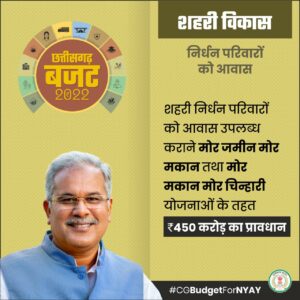 *7 शहरी निर्धन परिवारों को आवास उपलब्ध कराने हेतु ‘‘मोर जमीन मोर मकान’’ तथा ‘‘मोर मकान मोर चिन्हारी’’ योजनाओं में 450 करोड़ प्रावधान।*