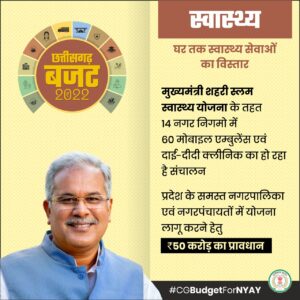 22 मुख्यमंत्री शहरी स्लम स्वास्थ्य योजना के तहत 14 नगर निगमों में 60 मोबाइल एम्बुलेंस एवं दाई-दीदी क्लीनिक का संचालन। इसे प्रदेश के समस्त नगरपालिका एवं नगरपंचायतों में लागू करने के लिये 50 करोड़ का प्रावधान।