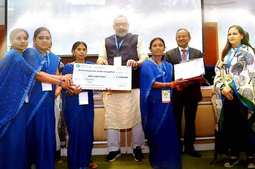 रायपुर. 9 मार्च 2022. छत्तीसगढ़ के राजनांदगांव जिले के सोनेसरार की आस्था संकुल संगठन को उत्कृष्ट कार्य के लिए भारत सरकार द्वारा आत्मनिर्भर संगठन पुरस्कार-2022 से सम्मानित किया गया है। केन्द्रीय पंचायतीराज एवं ग्रामीण विकास मंत्री श्री गिरिराज सिंह ने अंतरराष्ट्रीय महिला दिवस पर नई दिल्ली के विज्ञान भवन में आयोजित कार्यक्रम में संगठन को पुरस्कृत किया। उन्होंने आस्था संकुल संगठन को पुरस्कार स्वरूप एक लाख रूपए की राशि एवं प्रतीक चिन्ह प्रदान किया। पंचायत एवं ग्रामीण विकास मंत्री श्री टी.एस. सिंहदेव ने इस उपलब्धि पर संगठन की महिलाओं को बधाई और शुभकामनाएं दी हैं। उन्होंने कहा कि यह पुरस्कार प्रदेश की सभी महिला सामुदायिक संगठनों को अच्छा कार्य करने के लिए प्रेरित करेगी। ‘बिहान’ से जुड़ी महिलाओं की इस उपलब्धि से पूरा राज्य गौरवान्वित हुआ है। छत्तीसगढ़ राज्य ग्रामीण आजीविका मिशन (बिहान) की संचालक श्रीमती इफ्फत आरा और राजनांदगांव के जिला मिशन प्रबंधक श्री पिनाकी डेसरकार भी नई दिल्ली में आयोजित पुरस्कार समारोह में मौजूद थे।