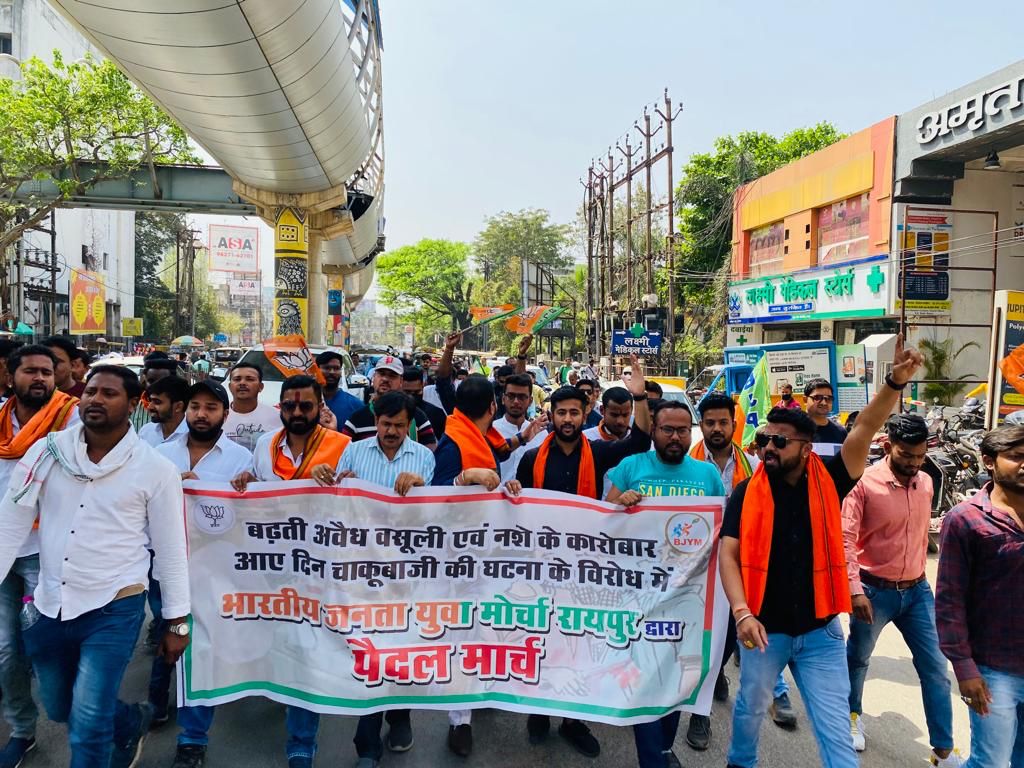 भाजयुमो द्वारा कई बार अपराध के विरुद्ध शासन को अवगत कराया गया परंतु शासन प्रशासन मौन बैठी है और आये दिन चाकू बाजी,चोरी, हत्या जैसे अपराध रायपुर में आम बात जैसी हो गई है जो की बहुत शर्मनाक बात है। पुलिस अपराध रोक नहीं पा रही है पर ट्रैफिक वसूली के लिए एक दम तत्परता के साथ पूरे शहर के चौक चौराहे में खड़े हो कर के जनता को परेशान किए जा रहे है।