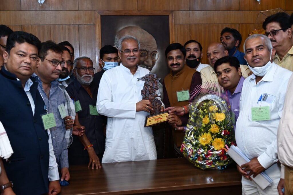 रायपुर, 15 मार्च 2022/ मुख्यमंत्री भूपेश बघेल से आज यहां उनके विधानसभा परिसर स्थित कार्यालय कक्ष में छत्तीसगढ़ कर्मचारी-अधिकारी फेडरेशन के प्रतिनिधि मंडल ने सौजन्य मुलाकात की। उन्होंने राज्य के अधिकारियों और कर्मचारियों के लिए पुरानी पेंशन योजना बहाली के फैसले के लिए मुख्यमंत्री को स्मृति चिन्ह, शॉल एवँ पुष्प गुच्छ भेंटकर उनका आभार व्यक्त किया। मुख्यमंत्री श्री बघेल ने राज्य के वर्ष 2022-23 के बजट में पुरानी पेंशन योजना लागू करने की घोषणा की है।