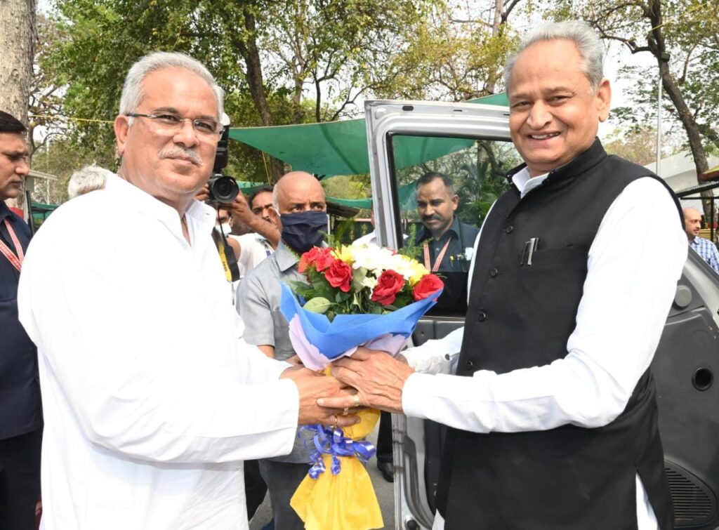 रायपुर, 25 मार्च 2022/ मुख्यमंत्री भूपेश बघेल ने आज यहां अपने निवास कार्यालय में राजस्थान के मुख्यमंत्री अशोक गहलोत का आत्मीय स्वागत किया। मुख्यमंत्री श्री गहलोत आज दोपहर रायपुर पहुंचे।वे एयरपोर्ट से सीधे मुख्यमंत्री निवास पहुंचे।