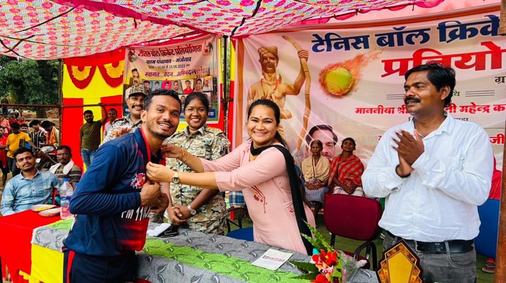 *दंतेवाड़ा।* शहीद वीर गुण्डाधुर युवा समिति एवं गंजेनार युवा क्रिकेट क्लब द्वारा टेनिस बॉल क्रिकेट प्रतियोगिता का आयोजन ग्राम पंचायत गंजेनार में किया गया। इस प्रतियोगिता में 12 पंचायत के खिलाड़ियों ने हिस्सा लिया। क्रिकेट प्रतियोगिता के समापन अवसर पर जिला पंचायत अध्यक्ष तुलिका कर्मा विशेष रूप से मौजूद रही। फाइनल मैच ग्राम पंचायत मोलसनार व ग्राम पंचायत गंजेनार के बीच खेला गया, जिसमें गंजेनार ने जीत हासिल की। खिलाड़ियों को संबोधित करते जिपं अध्यक्ष ने कहा कि खेल के प्रति युवाओं का जज्बा आज देखते ही बन रहा है। मेरे जिला पंचायत क्षेत्र में इस तरह की प्रतियोगिता आयोजित होना मेरे लिए गर्व की बात है। अंदरूनी इलाकों के युवा अब खेल के माध्यम से अपने गांव व जिले का नाम रौशन कर रहे हैं। तुलिका ने आगे कहा की जिले में बहुत जल्दी खिलाड़ियों के लिए खेल एकेडमी का निर्माण कराया जाएगा, जहां खिलाड़ी परिसर में ही रहकर खेल के गुर सीखेंगे साथ ही नेशनल स्तर पर होने वाले प्रतियोगिता में भाग लेंगे। पुलिस अधीक्षक सिद्धार्थ तिवारी द्वारा खिलाड़ियों के लिए क्रिकेट किट भी दिया गया, जिसे डीएसपी आशा रानी, आरआई लोकेश कसेर द्वारा खिलाड़ियों में वितरण किया गया। अंत में जिपं अध्यक्ष समेत सभी अतिथियों ने विजेता टीम को 15001 रुपए व कप वहीं दूसरी टीम को 7500 रुपए व कप उपहार स्वरूप प्रदान किया। इस दौरान धुरवा समाज के अध्यक्ष व आयोजन समिति से जुड़े जयराम कश्यप, अजय मरकाम, थाना प्रभारी कुआकोण्डा श्री भंडारी, सुरेश भास्कर समेत अन्य उपस्थित थे।