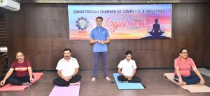रायपुर । छत्तीसगढ़ चेम्बर ऑफ कॉमर्स एंड इंडस्ट्रीज के प्रदेश अध्यक्ष अमर पारवानी, महामंत्री अजय भसीन, कोषाध्यक्ष उत्तम गोलछा, कार्यकारी अध्यक्ष राजेन्द्र जग्गी,विक्रम सिंहदेव,राम मंधान, मनमोहन अग्रवाल ने बताया कि अंतराष्ट्रीय योग दिवस के उपलक्ष्य में आज दिनांक 21 जुन 2022 को चेम्बर कार्यालय चै. देवीलाल व्यापार उद्योग भवन, बाम्बे मार्केट, रायपुर में चेंबर प्रदेश अध्यक्ष की उपस्थिति में योग गुरु प्रियंका उपाध्याय एवं जुम्बा नृत्य विशेषज्ञ दीपमाला की सहायता से योग शिविर का आयोजन किया गया। शिविर का शुभारंभ चेंबर महामंत्री अजय भसीन द्वारा किया गया।