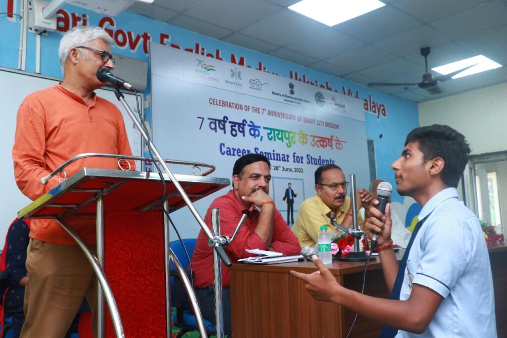 *रायपुर।* स्मार्ट सिटी मिशन की 7वीं वर्षगांठ पर रायपुर स्मार्ट सिटी लिमि. ने स्वामी आत्मानंद योजनांतर्गत संचालित आर.डी. तिवारी स्कूल के विद्यार्थियों के लिए “कैरियर मंत्र” वर्कशॉप आयोजित किया। नीति आयोग भारत सरकार के परामर्शदात्री सदस्य श्री जवाहर सुरीसेट्टी, भाषाविद् श्री विद्यापति शुक्ला ने विद्यार्थियों को उनके कैरियर के चयन निर्धारण व लक्ष्य को प्राप्त करने उपयोगी मार्गदर्शन प्रदान किया।