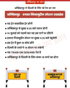 14 जुलाई से लोगों को मिलेगी अम्बिकापुर- हजरत निजामुद्दीन एक्सप्रेस ट्रेन की सौगात