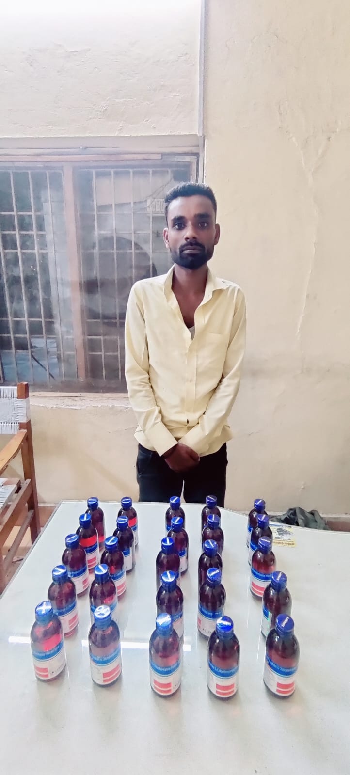 इसी क्रम में दिनांक 15.07.2022 को एण्टी क्राईम एवं सायबर यूनिट की टीम को सूचना प्राप्त हुई कि थाना कोतवाली क्षेत्रांतर्गत वीरभद्र नगर स्थित राम रमा पेट्रोल पंप पास एक व्यक्ति अपने पास बैग में प्रतिबंधित नशीली सिरप रखा है तथा बिक्री करने की फिराक में है। जिस पर अतिरिक्त पुलिस अधीक्षक अपराध श अभिषेक माहेश्वरी द्वारा प्रभारी एण्टी क्राईम एवं सायबर यूनिट तथा थाना प्रभारी कोतवाली को आरोपी को प्रतिबंधित नशीली सिरप के साथ रंगे हाथ पकड़ने निर्देशित किया गया। जिस पर एण्टी क्राईम एवं सायबर यूनिट तथा थाना कोतवाली की संयुक्त टीम द्वारा उक्त स्थान पर जाकर मुखबीर द्वारा बताए हुलिये के व्यक्ति को चिन्हांकित कर पकड़ा गया। पूछताछ में व्यक्ति ने अपना नाम शेख ईमरान निवासी टिकरापारा रायपुर का होना बताया। टीम के सदस्यों द्वारा उसके पास रखें बैग की तलाशी लेने पर बैग में ESKUF नामक प्रतिबंधित नशीली सिरप रखा होना पाया गया। उक्त प्रतिबंधित नशीली सिरप रखने के संबंध में आरोपी शेख ईमरान से वैध दस्तावेज या अन्य कागजात प्रस्तुत करने कहने पर उसके द्वारा किसी भी प्रकार का कोई वैध दस्तावेज या कागजात प्रस्तुत न कर टीम को लगातार गुमराह करने का प्रयास किया जा रहा था। जिस पर आरोपी शेख ईमरान को गिरफ्तार कर कब्जे से *कुल 25 शीशी ESKUF प्रतिबंधित नशीली कफ सिरप कीमती लगभग 4,500/- रूपये* जप्त कर आरोपी के विरूद्ध थाना कोतवाली में अपराध क्रमांक 218/22 धारा 21(सी) नारकोटिक्स एक्ट का अपराध पंजीबद्ध कर अग्रिम कार्यवाही किया गया।