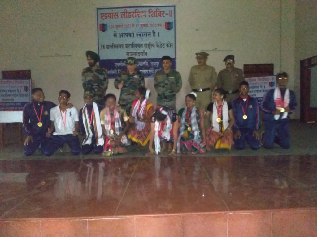 रायपुर । एनसीसी प्रशिक्षण अकादमी, लखोली रायपुर में आयोजित एनसीसी के एडवांस लीडरशिप कैंप का आज समापन समारोह हुआ। इस अवसर पर रंगारंग सांस्कृतिक कार्यक्रमों का आयोजन हुआ। उड़ीसा आंध्र प्रदेश मध्यप्रदेश एवं छत्तीसगढ़ के एनसीसी कैडेट्स ने सांस्कृतिक कार्यक्रमों में संपूर्ण भारतवर्ष के त्यौहारों एवं परंपराओं को दिखाया। कैंप की समस्त गतिविधियों जैसे ग्रुप डिस्कशन में बेस्ट प्रेजेंटेशन, कविता पाठ तथा खो-खो वालीबाल आदि क्रीड़ा स्पर्धाओं में उत्कृष्ट स्थान प्राप्त कैडेटों को पुरस्कृत किया गया। कैंप के विभिन्न अप्वाइंटमेंट्स को भी मैडल प्रदान किए गये।