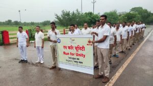 रायपुर । आजादी का अमृत महोत्सव के अवसर पर महा निरीक्षक-सह-प्रधान मुख्य सुरक्षा आयुक्त ए. एन. सिन्हा एवं मंडल सुरक्षा आयुक्त संजय कुमार गुप्ता के मार्गदर्शन में रेलवे सुरक्षा बल रायपुर मंडल के द्वारा मण्डल मुख्यालय में आजादी के अमृत महोत्सव के अवसर पर आयोजित कार्यक्रमो की श्रृंखला में रन फार यूनिटी का आयोजन सेकरेसा ग्राउंड डब्ल्यूआरएस से किया गया जिसमें 43 बल अधिकारी एवं सदस्यों के द्वारा भाग लेकर 3 किलोमीटर दौड़ लगाई गई, इस प्रकार 129 किलोमीटर दौड़ लगाकर एकता का संदेश दिया गया।