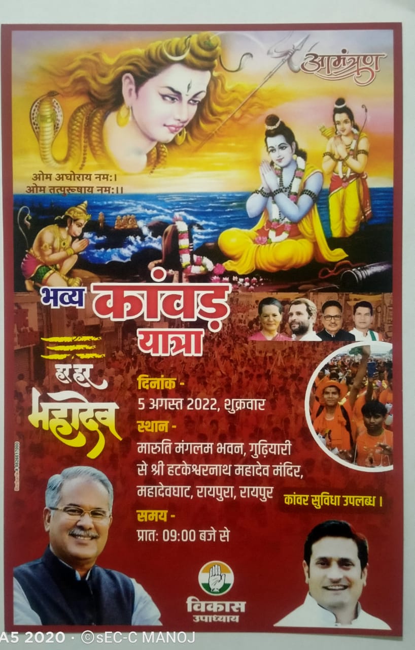 रायपुर । पश्चिम विधायक विकास उपाध्याय कल 05 अगस्त को अपने विधानसभा क्षेत्र गुढ़ियारी से विशाल एवं भव्य काँवड़ यात्रा निकालने जा रहे हैं। जिसमें विशेष रूप से मुख्यमंत्री भूपेश बघेल सम्मिलित होंगे। विकास उपाध्याय ने कहा, कोरोना काल के चलते विगत् दो वर्षों से हजारों भक्तगण काँवड़ यात्रा में सम्मिलित होने से वंचित थे, इसलिए इस बार इस यात्रा को लेकर विशेष इंतजाम किए गए हैं, जिसमें 10 हजार से भी ज्यादा भक्तगण सम्मिलित होंगे। उन्होंने कहा कि काँवड़ यात्रा का हिन्दू धर्म में विशेष महत्व है, क्योंकि इसे शिव भक्ति का प्रतीक माना जाता है और ठीक इसके अनुरूप भक्तगणों में उत्साह देखी जा रही है।