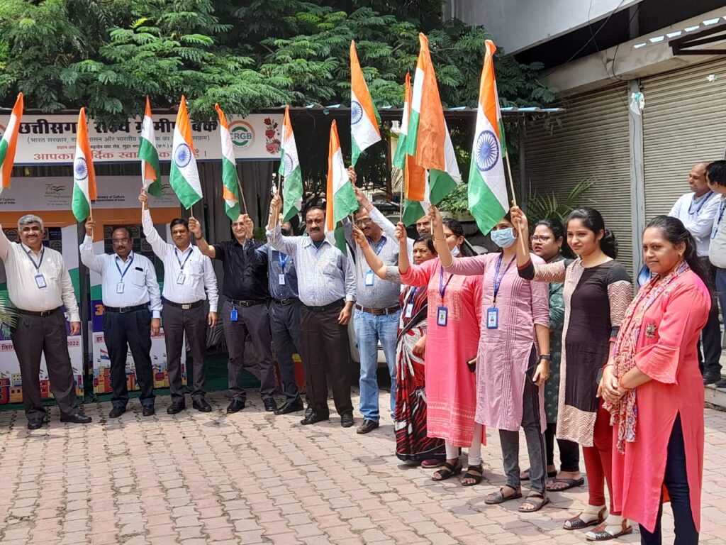 छत्तीसगढ़ राज्य ग्रामीण बैंक प्रधान कार्यालय – रायपुर में आजादी के अमृत महोत्सव हर घर तिरंगा अभियान का शुभारंभ अध्यक्ष द्वारा किया गया।भारत माता की जयकारों के बीच आजादी के लिए अमर शहीदों को अध्यक्ष आई. के. गोहिल ने नमन किया।
