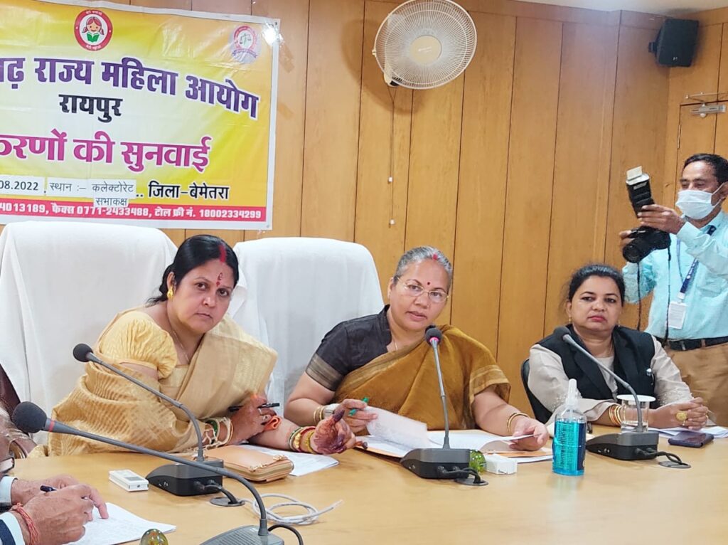 बेमेतरा 08 अगस्त 2022-छत्तीसगढ़ राज्य महिला आयोग की अध्यक्ष डॉ. किरणमयी नायक एवं सदस्य अर्चना उपाध्याय की अध्यक्षता में आज सोमवार को महिला आयोग की जनसुनवाई कलेक्टोरेट सभाकक्ष में रखी गई। जनसुनवाई के लिए बेमेतरा जिले के 16 विभिन्न मामलों के प्रकरण रखे गये जिसमें से 13 प्रकरणों का निबटारा कर नस्तीबद्ध किया गया। एक प्रकरण सुनवाई के लिए रायपुर स्थानांतरित किया गया। इस अवसर पर जिला महिला एवं बाल विकास अधिकारी रमाकांत चंद्राकर, अधिवक्ता सुश्री शमीम रहमान, डॉ. अखिलेश भारद्वाज, शासकीय अभिभाषक/लोक अभियोजन बेमेतरा दिनेश तिवारी, परियोजना अधिकारी म.बा.वि. श्रीमती मनोरमा साहू सहित उभयपक्ष के आवेदिका एवं अनावेदक उपस्थित थे।