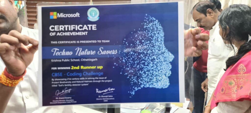 रायपुर । कृष्णा पब्लिक स्कूल , कमल विहार रायपुर के क्लास 8 के छात्र सन्वय भट्टाचार्य ( टीम टेक्नो नेचर सेवर ) ने केवल छत्तीसगढ राज्य नहीं वरन सेन्ट्रल इंडिया का भी गौरव बढ़ाया है । वर्तमान में सीबीएससी एवं माइक्रोसाफ्ट इंडिया ने एक नेशनल कोडिंग कम्पीटशन 2022-23 का आयोजन किया था । स्कूल एवं राज्य स्तरीय से उत्तीर्ण होने के पश्चात उक्त दोनों छात्र ने अपने स्कूल का एवं राज्य का प्रतिनिधित्व किया था , जिसमें पूरे भारत से कुल मिलाकर 2310 प्रतिभागी ने प्रतियोगिता में भाग लिया जिसमें दोनों छात्रों ने इस प्रतियोगिता में तीसरे स्थान प्राप्त किये और स्कूल को गौरन्वित किया । मिस्टर आर.पी. सिहं , ज्वाइन सक्रेटरी , स्कील एजुकेशन नईदिल्ली , डॉ . विनी जौहरी , लर्निग एण्ड स्किल हेड माइक्रोसाफ्ट इंडिया एवं सम्ममानीय सीबीएससी के पदाधिकारी के उपस्थिति में कृष्णा पब्लिक स्कूल के उक्त दोनो छात्रों को जिन्होंने प्राजेक्ट ” बायोड्रावरसिटी एवं नेचुरल हेविटेट * थीम के उपर में कार्य किया था उन्होने एक सोलर एनर्जी से चलने वाला एक कार प्रस्तुत किये है जो कार जमीन की नमी को नापने की क्षमता रखता है और साथ ही साथ जहाँ नमी की मात्रा के कमी के आधार पर वहाँ पर पानी दिया जा सकता है । इस प्रोजेक्ट से सिंचाई कार्य में लगाने वाले अतिरिक्त पानी को रोका जा सकता है । इस प्रोजेक्ट को बनाने में दोनो छात्रो को कुल 45 दिन का समय लगा और इस प्रोजेक्ट को बनाने में कृष्णा पब्लिक स्कूल के कम्प्यूटर विभाग के टीचरों ने अपना बहुमूल्य योगदान दिया । *साथ ही माननीय स्कूल शिक्षा मंत्री डॉ प्रेमसाय सिंह टेकाम जी ने भी इन बच्चों का प्रोत्साहन किया व उज्ज्वल भविष्य की शुभकामनाएं दिया ।*