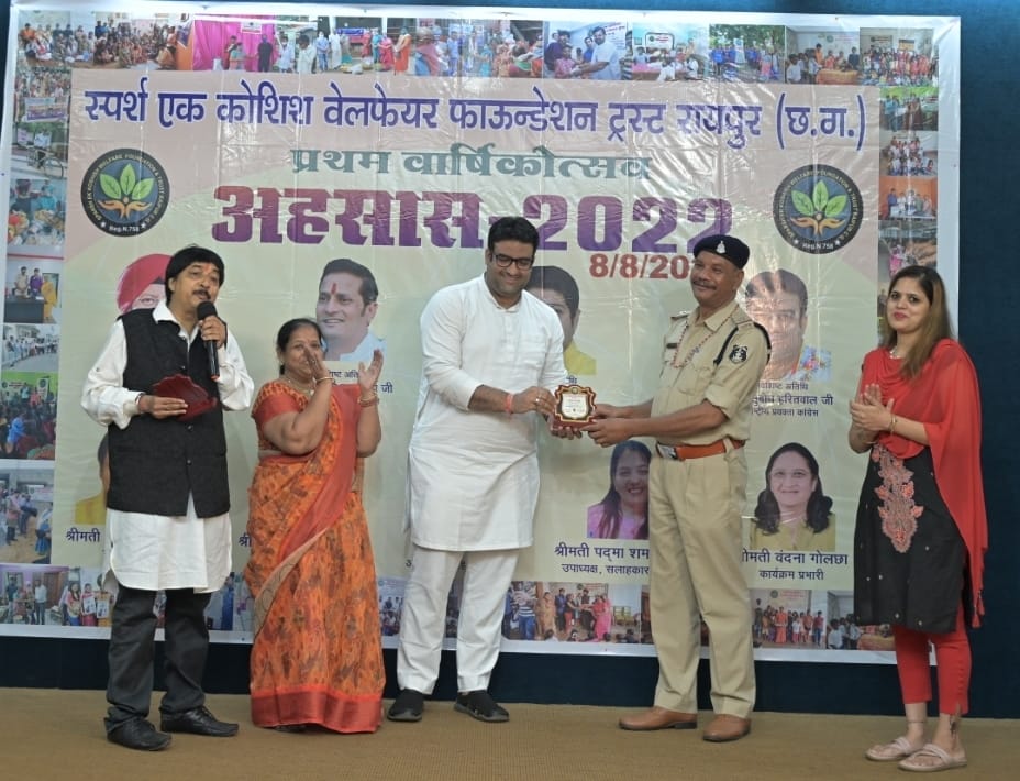 रायपुर . राजधानी के वृंदावन हॉल में 8 अगस्त को स्पर्श एक कोशिश वेलफेयर फाउंडेशन ट्रस्ट रायपुर का प्रथम वार्षिकोत्सव अहसास 2022का आयोजन हुआ । जिसमें परमजीत खनूजा एवं राष्ट्रीय प्रवक्ता कांग्रेस सुबोध हरितवाल विशेष अतिथि रहे । कार्यक्रम के संबंध में फाउंडेशन के अध्यक्ष सोनाली लुनिया एवं संस्थापक अनिता लुनिया ने जानकारी दी कि आयोजित कार्यक्रम में फाउंडेशन के सलाहकार समिति के अध्यक्ष जेएस ठाकुर ,पदमा शर्मा एवं वंदना गोलछा भी उपस्थित रही । इसके साथ ही फाउंडेशन की ओर से अपने क्षेत्र में विशेष उपलब्धि हासिल करने वाले लोगों को सम्मानित भी किया गया । कार्यक्रम में विशु अग्रवाल ,टी.के.भोई , जितेंद्र महारा , ममता सुराणा , सुनीता झाबक , मंजू टाटिया , ललिता लुनिया , मीना लुनिया , मधु जैन , अलका ठाकुर प्रकाश सांखला , नीलम पारख , विभा रायपुरिया , विलासराव साखरे , निखत फिरोज , राधिका अग्रवाल , आयुषी टेंबोनिकर , यशस्वी गायकवाड़ कीर्ति बैद , मंजू टाटिया , विजय श्री स्वामी , उमा स्वामी , यश वैद , चंदेश बेदमुथा , राजू डागा , पुष्पेंद्र , हिमांशु राजपूत प्रकाश साहू एवं कोपलवाणी के बच्चे अंजलि देशपांडे भी का सम्मान किया गया।