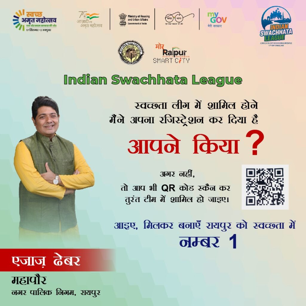 रायपुर । इंडियन स्वच्छता लीग कार्यक्रम के तहत 17 सितम्बर से 2 अक्टूबर तक स्वच्छ रायपुर स्वस्थ रायपुर अभियान राजधानी में चलाया जायेगा, महापौर श्री एजाज ढेबर ने स्वच्छता लीग में शामिल होने क्यूआर कोड स्कैन कर रजिस्ट्रेषन करवाकर रायपुर को स्वच्छता में नंबर 1 बनाने का किया आव्हान 0