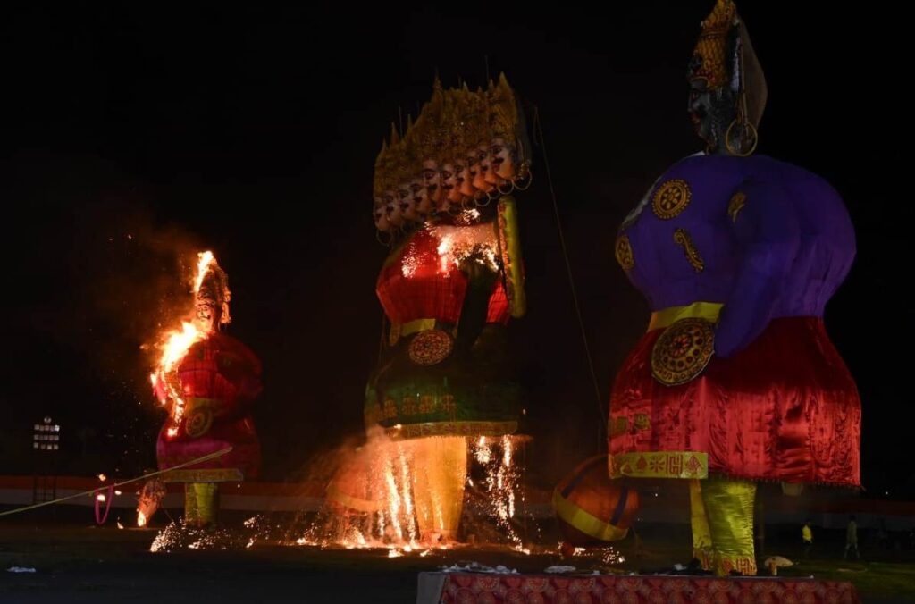 रायपुर । डब्ल्यू आर एस मैदान में आयोजित दशहरा पर्व के उपलक्ष्य में रावण दहन के कार्यक्रम में रेलवे सुरक्षा बल रायपुर, नागपुर एवं बिलासपुर मंडल के अधिकारी व बल सदस्य सहित कुल 63 बल उपस्थित रहे जोकि बंदोबस्त ड्यूटी के लिए उरकुरा समपार फाटक से मंडी समपार फाटक तक एवं मध्य में ट्रैक साइड पेट्रोलिंग में सुरक्षा के दृष्टिकोण से तैनात रहे । RPF द्वारा रेलवे ट्रेक की निगरानी के लिए ड्रोन का भी इस्तेमाल किया गया। इसके साथ ही साथ रेलवे सुरक्षा बल के अधिकारी एवं बल सदस्य वीआईपी एंट्रेंस में भी स्थानीय पुलिस की मदद हेतु तैनात रहे समय लगभग 18:00 बजे मुख्य अतिथि मुख्यमंत्री भूपेश बघेल एवं अन्य गणमान्य उपस्थित हुए और रावण दहन का कार्यक्रम समय 7:15 बजे समाप्त हुआ। सभी गणमान्य 19:30 बजे तक चले गए इस दौरान स्थिति शांतिपूर्ण रही रेल लाइन पर किसी भी तरह की कोई घटना घटित नहीं हुई ।