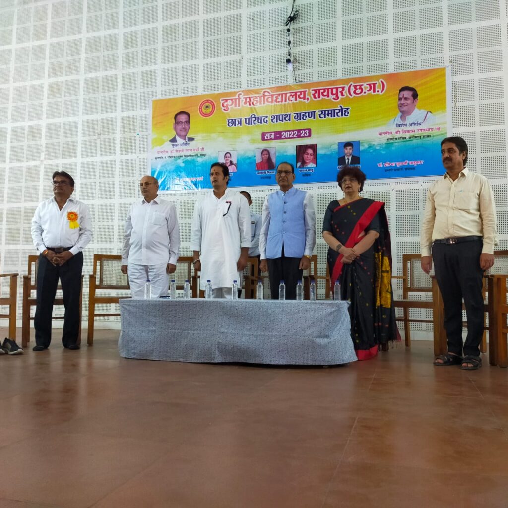 रायपुर । छात्र परिषद 2022 23 शपथ ग्रहण समारोह दुर्गा महाविद्यालय में आज दिनांक 21 अक्टूबर 2022 को प्रवीण नेता के आधार पर नव मनोनीत छात्रसंघ के पदाधिकारियों का शपथ ग्रहण संपन्न हुआ उक्त समारोह में कुलपति पंडित रविशंकर शुक्ल विश्वविद्यालय डॉक्टर के एल्बम आर जी के मुख्य अतिथि तथा विशेष अतिथि के रुप में विधायक एवं संसदीय सचिव छत्तीसगढ़ शासन माननीय विकास उपाध्याय जी उपस्थित थे इस अवसर पर छात्र परिषद के समस्त पदाधिकारी गण अध्यक्ष श्रुति राय उपाध्यक्ष यामिनी निषाद सचिव पायल साहू सह सचिव नितेश महाल्दार छात्र परिषद प्रभारी डॉ अजय कुमार शर्मा महाविद्यालय की प्राचार्य प्रतिभा मुखर्जी साहूकार एवं उप प्राचार्य डॉक्टर सुरेंद्र अग्रवाल तथा समस्त प्राध्यापक गण एवं कर्मचारी उपस्थित थे कार्यक्रम का प्रारंभ अतिथि गण सहित प्राचार्य एवं छात्र परिषद द्वारा दीप प्रज्वलन मां सरस्वती के पूजन से हुआ अपने संबोधन में माननीय मुकद अतिथि कुलपति डॉक्टर के एल वर्मा ने कहा कि दुर्गा महाविद्यालय जो अनुशासन वह उचित शिक्षा के बल पर अपने गौरवशाली परंपरा को बनाए रखे हैं महाविद्यालय की प्राचार्य एवं शिक्षकों का यह दायित्व है कि महाविद्यालय में सुदृढ़ अनुशासन एवं अध्यापन कार्य पूर्ण निष्ठा से संपन्न हो कार्यक्रम के विशेष अतिथि माननीय विकास उपाध्याय जी ने कहा कि दुर्गा महाविद्यालय मेरे परिवार से बड़ा है जब कभी दुर्गा महाविद्यालय मुझे याद करेगा मैं जब तक रहूंगा पहली प्राथमिकता दुर्गा महाविद्यालय को दूंगा इस महाविद्यालय से मेरे राजनीतिक जीवन का प्रारंभ हुआ है मेरी सफलता एवं संस्कार मुझे यही के शिक्षकों से प्राप्त हुआ है प्रवीण सूची के आधार पर मनोनयन से छात्र-छात्राओं को शिक्षा एवं परीक्षा में उत्कृष्ट प्रदर्शन की प्रेरणा मिलेगी जिससे वे भविष्य में बेहतर रोजगार के अवसर भी प्राप्त कर समाज को नई दिशा प्रदान कर महाविद्यालय का नाम स्वर्ण अक्षरों में अंकित कराएंगे श्री आर के शुक्ला सचिव दुर्गा शिक्षण समिति ने अपने उद्बोधन में कहा कि छत्तीसगढ़ में दुर्गा महाविद्यालय की एक अपनी अलग पहचान है दुर्गा शिक्षण समिति हर कदम पर महाविद्यालय एवं छात्रों के साथ हैं शिक्षा में नवाचार के लिए दुर्गा शिक्षण समिति महाविद्यालय को यथासंभव सहयोग करेगी महाविद्यालय की प्राचार्य डॉ प्रतिभा मुखर्जी साहूकार ने समस्त अतिथियों का महा विद्यालय परिवार की ओर से औपचारिक स्वागत कर कहा कि शिक्षा के इस मंदिर में हम अपने बीच शिक्षा के आधार स्तंभ श्रीमान कुलपति जी एवं महाविद्यालय के पूर्व छात्र विकास उपाध्याय जी को अपने बीच पाकर अभिभूत हैं छात्र परिषद प्रभारी प्राध्यापक डॉ अजय कुमार शर्मा जी ने छात्र परिषद के पदाधिकारियों