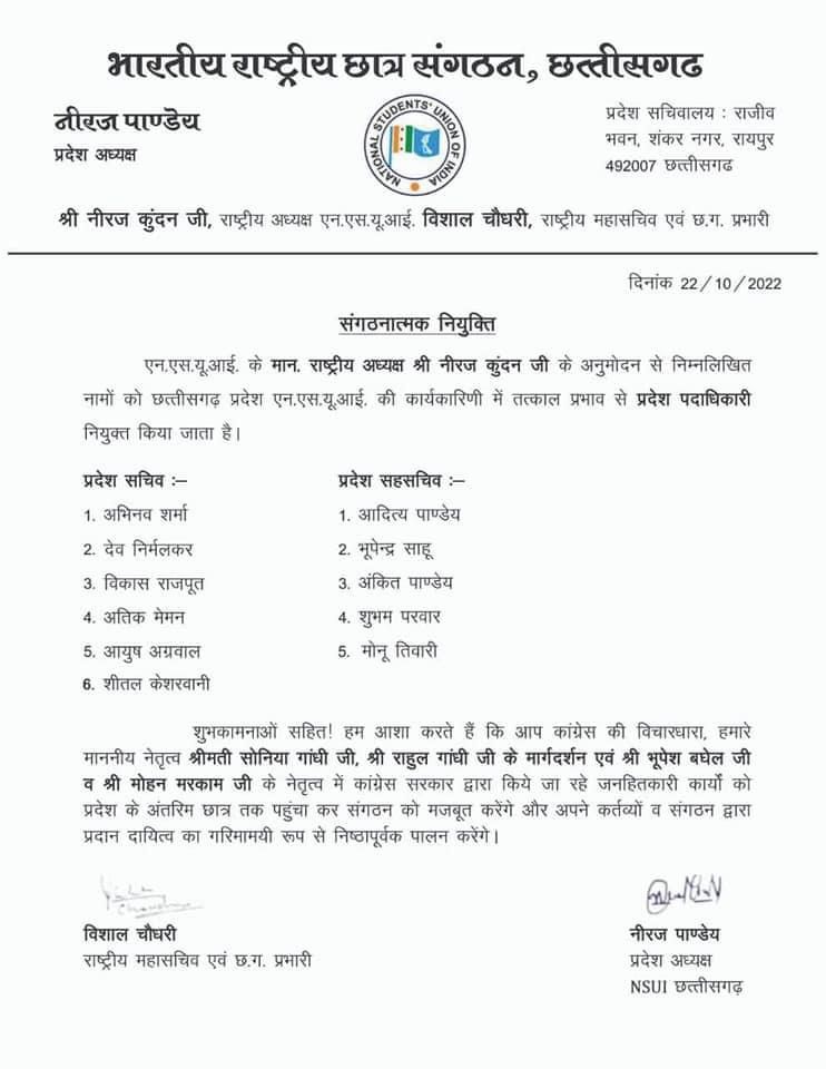 रायपुर । एनएसयूआई के राष्ट्रीय अध्यक्ष नीरज कुंदन छत्तीसगढ़ प्रभारी विशाल चौधरी के अनुमोदन से युवा कोंग्रेस के प्रदेश अध्यक्ष आकाश शर्मा की अनुशंसा पर NSUI के प्रदेश अध्यक्ष नीरज पाण्डेय द्वारा भूपेन्द्र साहू को NSUI प्रदेश सह -सचिव नियुक्त किया गया