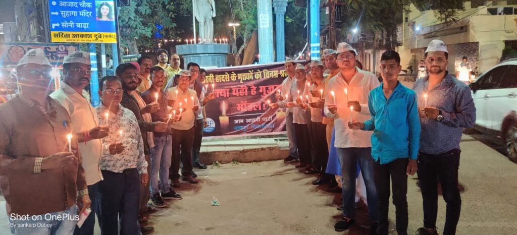 आप नेता विजय कुमार झा एवं वीरेंद्र पवार ने बताया कि गुजरात में अंग्रेज जमाने के बने हुए फूल पर लोग खुशहाली मनाने मनोरंजन करने गए थे उस जर्जर पुल में जहां पर भी टूट-फूट था उसे तार से जोड़ा गया था एक नवयुवक लड़का अपने पैरों से बारंबार खंबे को मार रहा था इसके पहले कभी ठेका ना लेने वाले ठेका कंपनी को इसके जीर्णोद्धार के लिए करोड़ों रुपए का ठेका देकर भ्रष्टाचार किया गया और अंततोगत्वा दिवाली के समय जब लोग खुशियां बांट रहे थे तब पुल के टूटने और उससे गिरने से लगभग 140 गुजरात के निर्दोष नागरिक दिवंगत हो गए अनेकों के शव भी प्राप्त नहीं हो पाए हैं यह भ्रष्टाचार में गुजरात सरकार की ठेका प्रथा व जन सुरक्षा में व्यापक लापरवाही को स्पष्ट परिलक्षित करती है आम आदमी पार्टी ने आपातकालीन बैठक में निर्णय लेकर संध्या 6:00 बजे आजाद चौक में दिवंगत आत्माओं को मोमबत्ती जलाकर श्रद्धांजलि अर्पित किया तथा 2 मिनट मौन धारण कर मृतकों के मुक्ति और शांति की प्रार्थना ईश्वर से करते हुए मृतक परिवार के दुख में सहभागी होना बताया है।